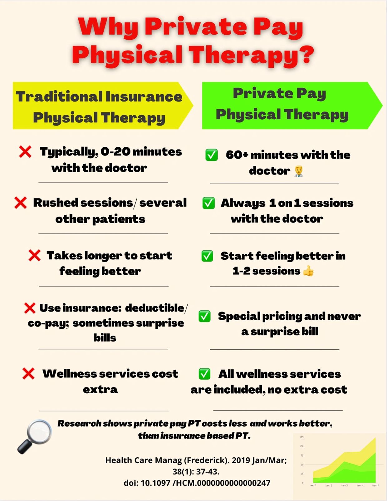 We are an out-of-network/ private-pay clinic, and don't accept insurance. This allows us to provide a high quality service, with quicker results by having 100% of services performed by the Doctor of Physical Therapy, without treatment restrictions or other patients scheduled at the same time.